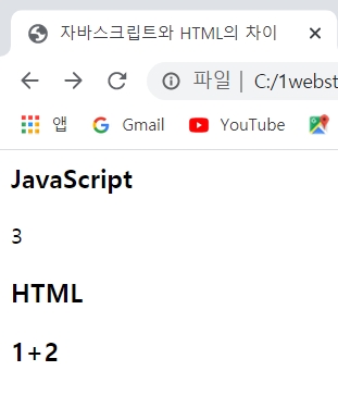자바스크립트는 1+2에 대한 연산을 실행하여 출력을 하는 동적인 특징을 갖지만 HTML은 정적이므로 값을 그대로 출력만 할 수 있습니다.