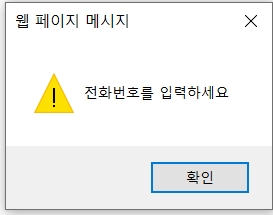 전화번호 텍스트 박스 상자가 3개 있는데 텍스트 박스에 정보를 입력하지 않은 상태에서 커서를 올려놓았다가 다시 텍스트 박스 이외의 영역을 클릭하게 되면 다음과 같이 alert() 메소드에 의해서 경고 메시지가 나옵니다.