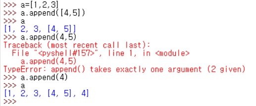 append함수에 두 개 이상의 값을 추가 할려다가 오류가 떴음을 확인할 수 있습니다.