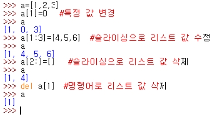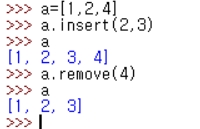형식 : 리스트.insert(삽입할 위치, 삽입할 값) , 리스트.remove(삭제할 값)