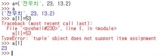 - 리스트와 비슷하지만, 튜플에 한 번 넣은 값은 넣은 자리에 다른 값으로 변경할 수 없습니다.