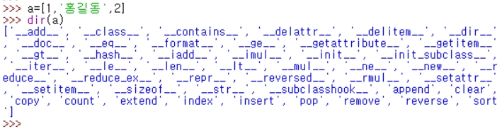dir 함수 - 리스트는 클래스이고 내부에 포함되는 함수나 변수들을 dir함수로 확인할 수 있습니다.