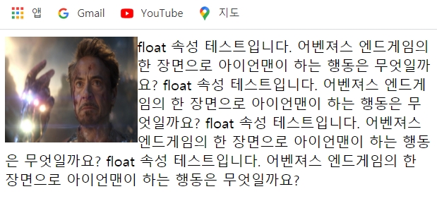 float 속성 테스트입니다. 어벤져스 엔드게임의 한 장면으로 아이언맨이 하는 행동은 무엇일까요?