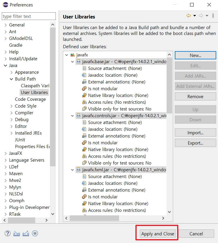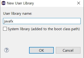 이클립스 환경으로 돌아와서 오류가 있는 javafx프로젝트를 가리키는 UserLibrary를 만들 것입니다.
