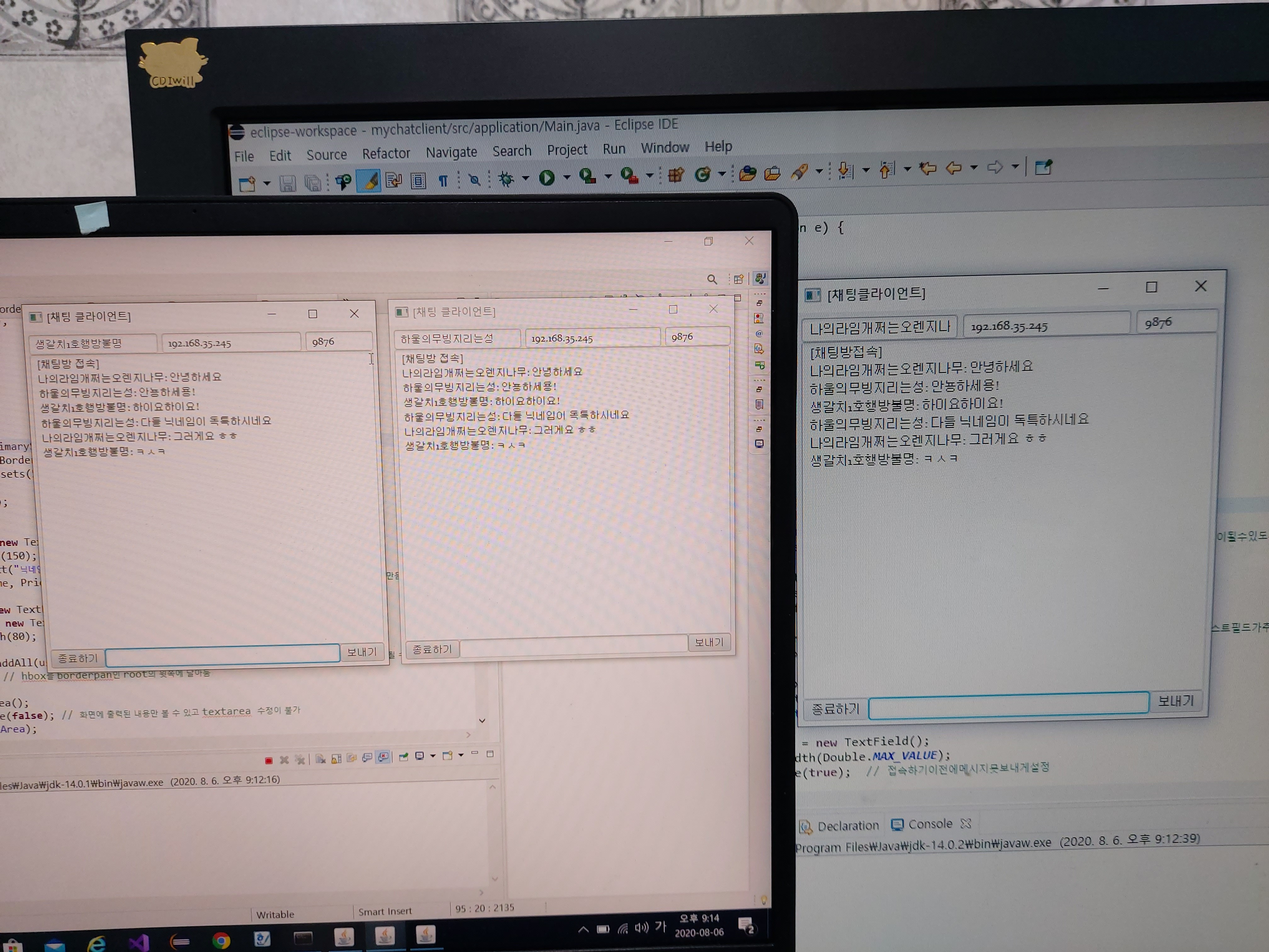 노트북에는 서버컴퓨터 역할을 할 서버 컴퓨터 코드와 클라이언트 코드를 짜서 서버컴퓨터 기능을 하게 하고, 데스크톱에는 오직 클라이언트 코드만 짜서 클라이언트 컴퓨터 기능을 하게 했습니다.