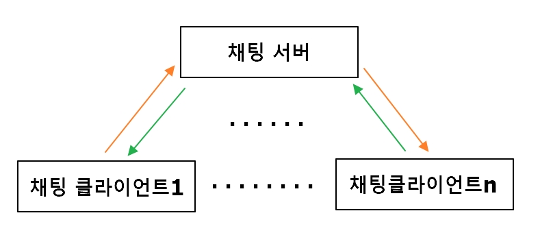 채팅 서버에 접속한 채팅 클라이언트들이 서로 소통을 하기 위해서 보내고자 하는 메시지를 채팅 서버에 보내면 해당 내용을 채팅 서버에 접속한 클라이언트들에게 브로드 캐스팅되는 형식입니다.