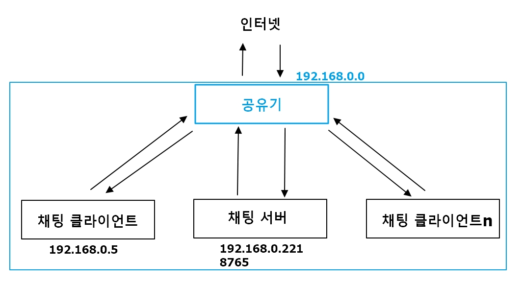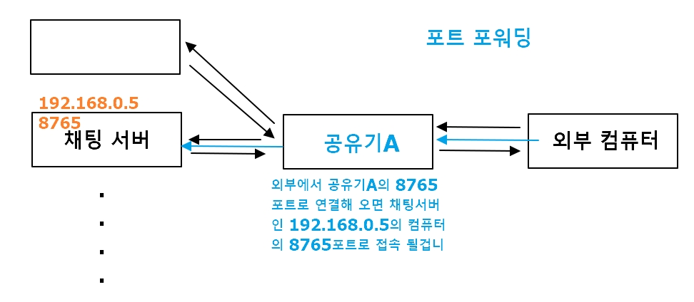 공유기 A에서 포트 포워딩 설정을 자신의 8765 포트로 접속을 하면 192.168.0.5의 8765포트로 연결을 하게 설정을 하면 위와 같이 외부 컴퓨터에서 채팅 서버로 접속이 가능하게 됩니다.