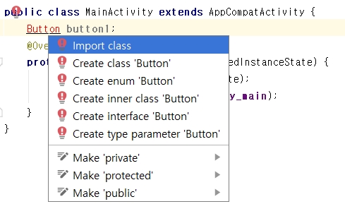 button1 = (Button) findViewById(R.id.button1); //button1에 객체선언 activity_main.xml의 button1 객체대입
