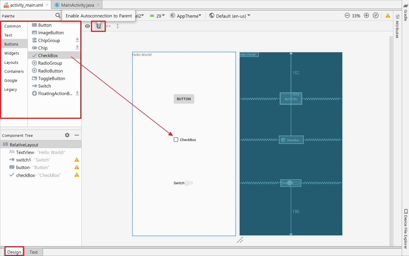 다시 [Design] 탭으로 이동해서 [Enablre Autoconnection to parent] 아이콘을 누르고 왼쪽의 위젯 중에서 원하는 아무거나 몇 개를 마우스 드래그해서 오른쪽에 놓습니다.