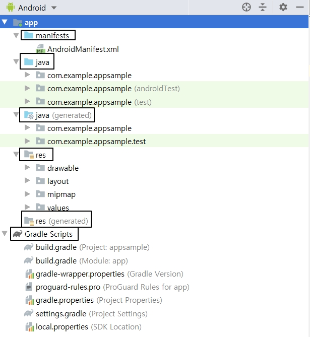 하위에 패키지 명의 하위 폴더가 있는데, 이는 안드로이드 프로젝트를 생성할 때 입력한 패키지 이름과 동일한 것입니다.
