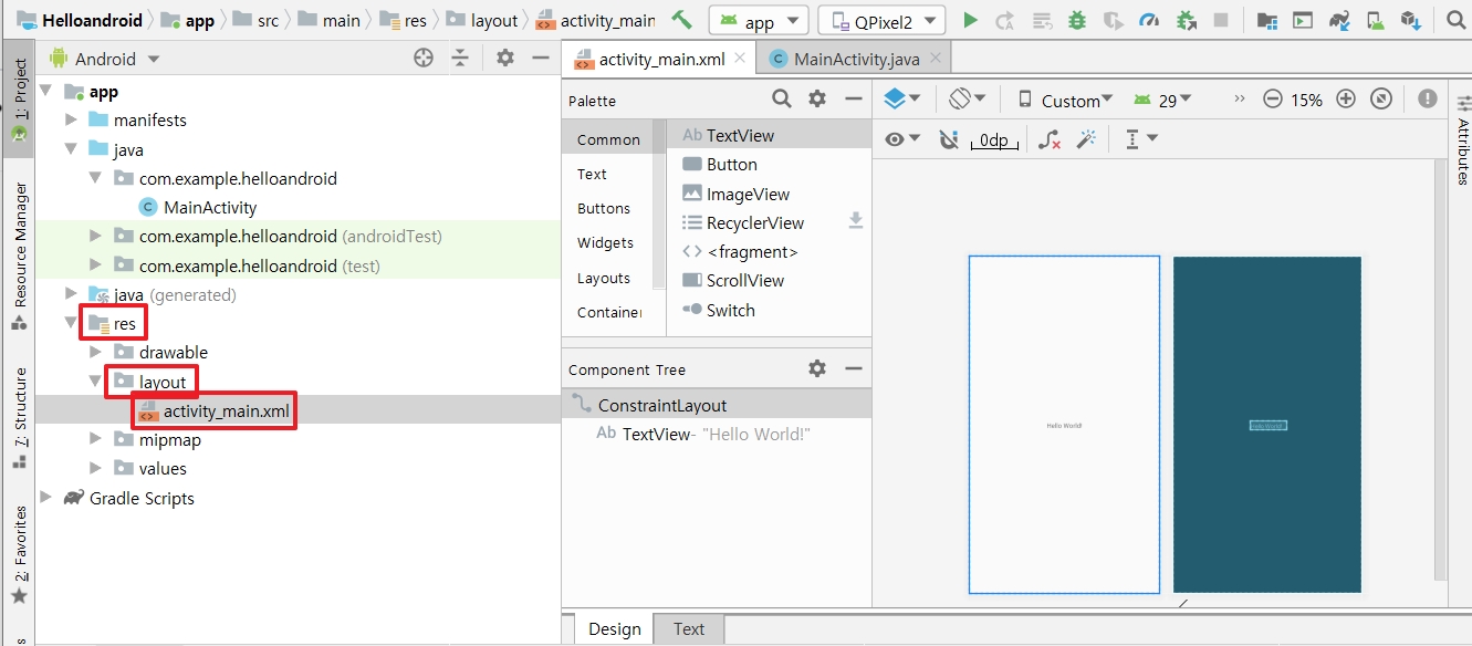 (2) layout 폴더 : 화면을 구성하는 xml 파일을 넣음 (activity_main.xml)이 초기화면으로 기본적으로 지정됨)