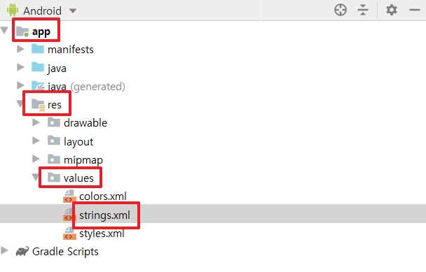 strings.xml을 설정해야 하므로 좌측 파일 트리의 [app] -> [res] -> [values] -> [string.xml]에 코드를 추가합니다.
