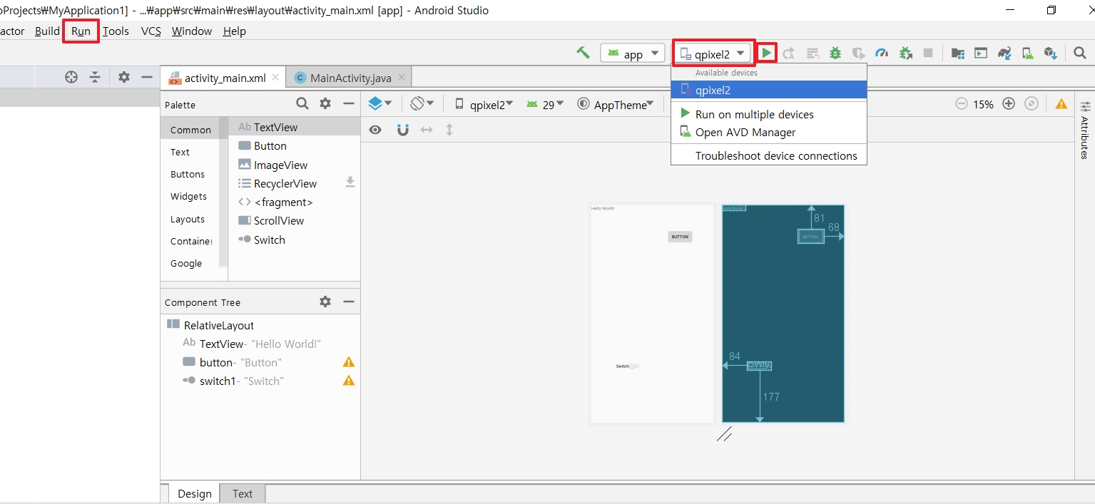 activiy_main.xml 창 왼쪽 하단에 [Text] 탭을 누르면 해당 코드가 나오는데 2번째 줄의 androidx.constraintlayout.widget.ConstraintLayout 부분을 RelativeLayout으로 변경합니다.