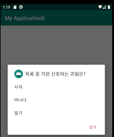 adb.setTitle("목록 중 가장 선호하는 과일은?");