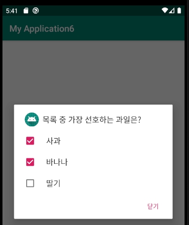 라디오 버튼과 달리 여러 개를 동시에 선택하려면 setMultiChoiceItems()를 사용합니다.