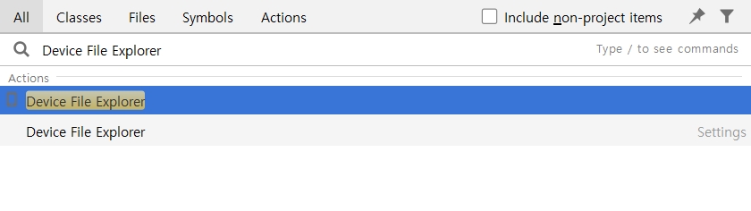 2. [Shift]를 두 번 연속 클릭 후 "Device file explorer"라고 검색합니다.