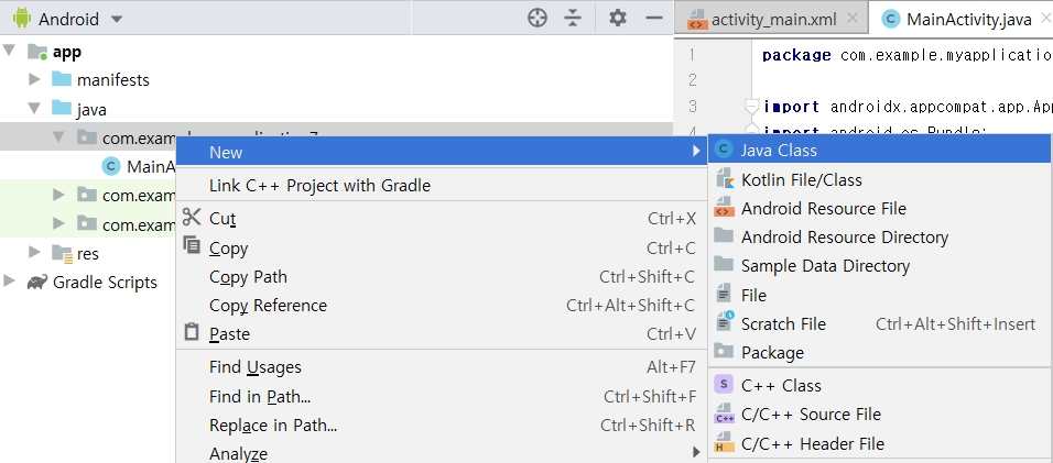 우선 새로운 클래스가 필요하므로 Project Tree의 [java] -> [패키지명]에서 오른쪽 버튼을 클릭한 후 [New] -> [Java Class]를 선택해서 'myPictureview'라는 이름으로 클래스를 생성하겠습니다.