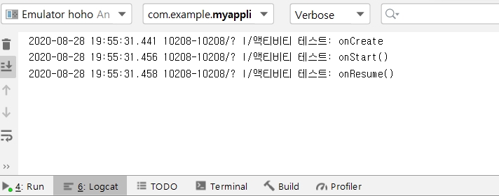 다음은 로그캣을 이용해서 액티비티 생명주기를 확인할 수 있는 예제입니다.