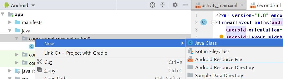 그리고 그에 맞는 액티비티인 자바도 Project Tree에서 [New] - [Java Class]를 선택해서 이름 설정하고 [OK]를 클릭합니다.