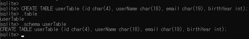.schema userTable // 해당 테이블의 열, 데이터 형식 등의 정보를 보여줌