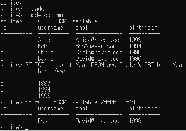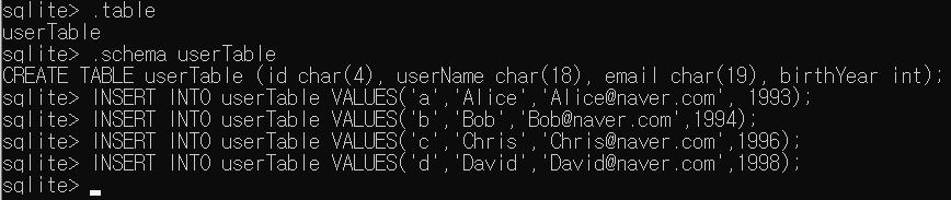 예외적으로 SQLite 자체 명령은 소문자로 써야 하고 시작에 마침표(.)를 붙이며 끝에 세미콜론을 붙이지 않아도 됩니다.