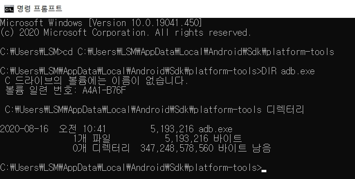 cd C:\Users\사용자명\AppData\Local\Android\Sdk\platform-tools