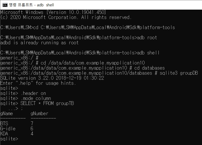 cursor = sqlDB.rawQuery("SELECT * FROM groupTB;", null); // 모든 테이블 조회후 커서에 대입