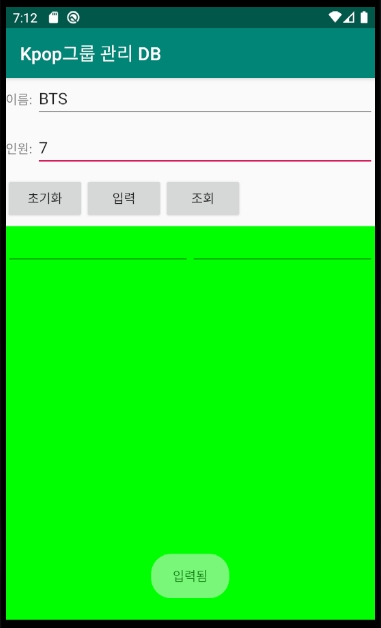 이름과 인원에 데이터를 넣고 '입력'버튼을 누르면 토스트가 잘 나오면서 데이터베이스에 데이터가 저장됩니다.