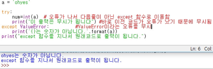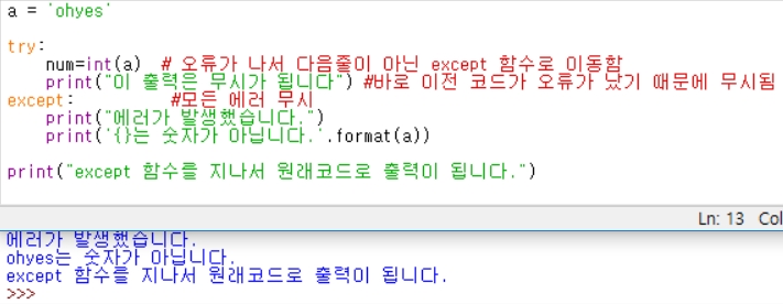 - try함수에 오류가 없는 코드를 넣으면 except 함수는 실행되지 않음.