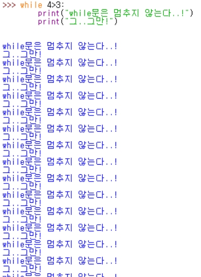 계속 반복이 되므로 while 문을 멈추려면 ctrl+c를 누르면 멈춥니다.