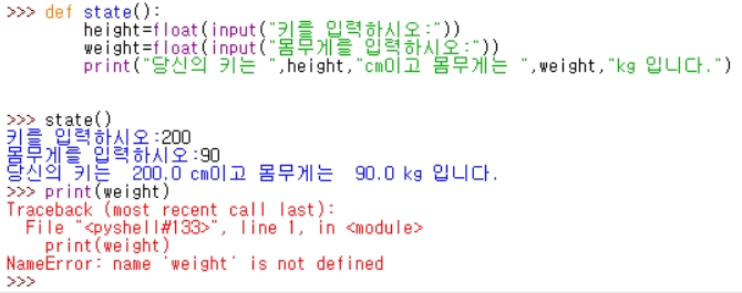 state()라는 함수에서 선언된 weigth이라는 변수는 state라는 함수의 지역에서만 선언된 변수이기 때문에