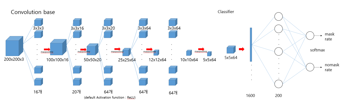 하고자 하는 것이 얼굴 이미지로 부터 해당 인물의 마스크 착용여부를 분류하는 것이므로 Supervised learning의 Classification 기법으로 모델을 설계하였습니다.