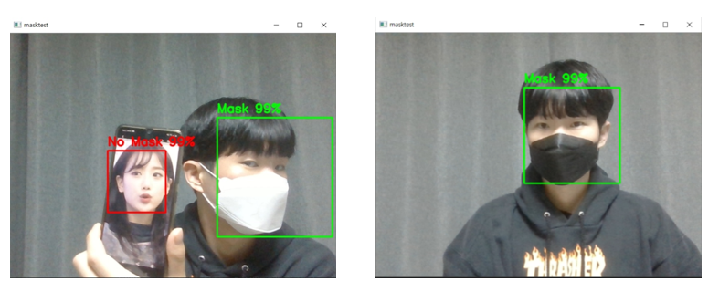 흰색 마스크와 검은색 마스크 모두 인식이 잘되며 마스크를 쓰지 않은 인물도 잘 인식하는 것을 확인할 수 있습니다.