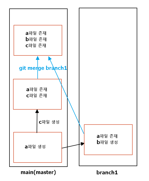 그 이유는 branch1에서 b라는 파일이 생성됨으로써 branch1에서 수정사항이 발생하는 동안 main에서는 아무런 변화(수정)가 없었으므로 어차피 병합될 마당에 굳이 가지를 쳐서 표현할 필요가 없기 때문입니다.