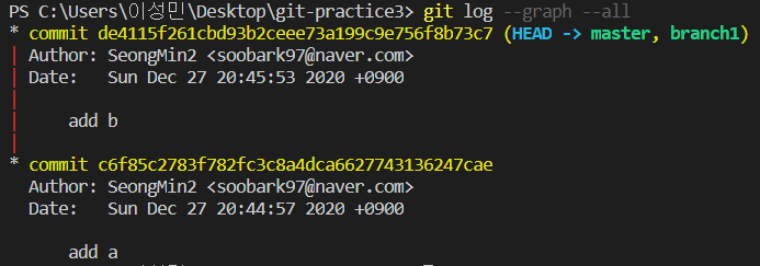 옆으로 가지치기가 되려면 branch1에서 무언가가 수정되는 동안 main에서도 수정이 이뤄지고 그 후에 병합이 되어야 옆으로 가지치기가 된 그래프를 확인할 수 있습니다.