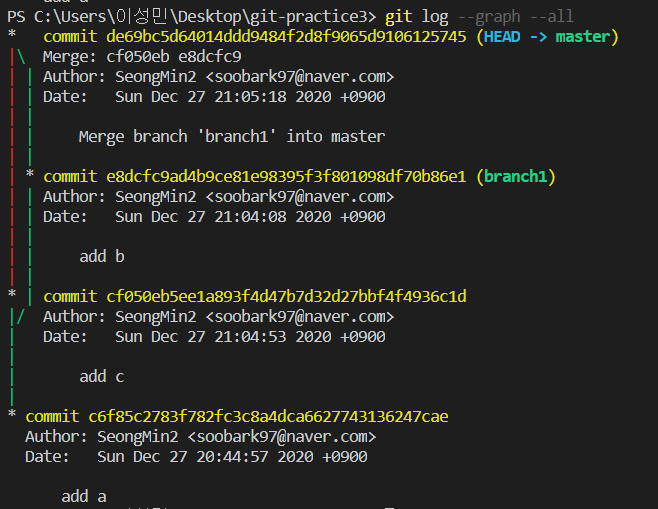 git log에 --graph 옵션을 붙여주면 나름 시각적으로 branch 간의 연결을 확인할 수 있습니다.