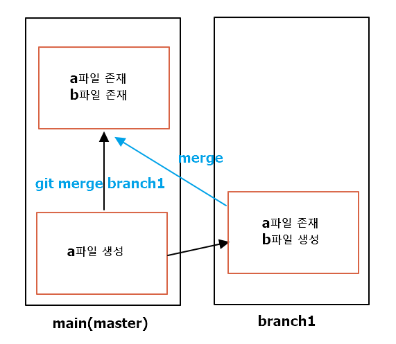 현재 branch가 main인 상태에서 git merge branch1을 하면 conflict 될 요소가 없으니 말끔하게 서로 병합이 됩니다.