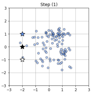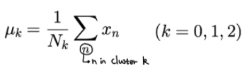 (Step(2)에서 입력데이터들의 결정된 클러스터들 끼리의 각 위치의 평균을 구하면 해당 클러스터의 중심 벡터를 구할 수 있음. 그러므로 그 중심벡터로 갱신함.)