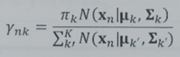 전체 클러스터에 대한 입력데이터의 클러스터 확률을 부담률(responsibility)이라고 하며 γ(감마)로 표기합니다.