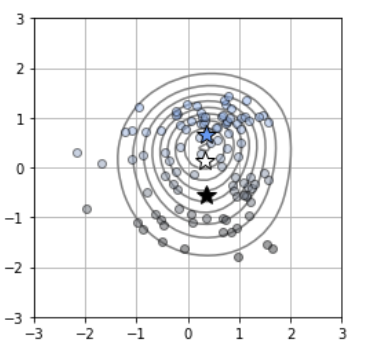 πk ,μk ,Σk 의 값들을 모두 갱신시킨 가우시안 모델은 다음과 같이 그려지게 됩니다.