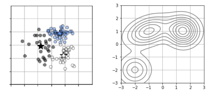 K-means 알고리즘에 가우시안 혼합 모델이 사용되는 이유는 다음 사진을 통해 가우시안 혼합 모델과 K-means를 이용한 데이터 분포가 서로 형태가 비슷하다는 것을 알 수 있기 때문입니다.