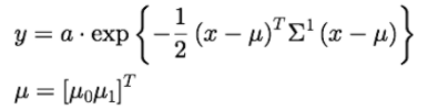 2차원 가우스 함수는 X를 2차원 벡터라고 했을 때 기본식은 다음과 같습니다.