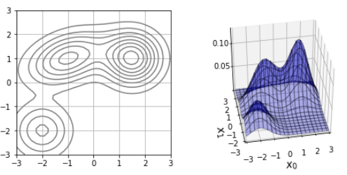 입력 데이터가 조밀한 부분을 중심으로 가우스 함수가 배치되어, 입력 데이터가 띄엄띄엄한 부분은 분포의 값이 낮도록 매개변수가 조정됩니다.