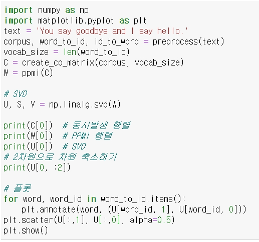 책의 경우에는 차원축소 과정에서 기존 데이터의 평균을 0으로 만들지 않았고, U와 S의 곱을 사용하지 않고 U 값만을 사용하여 단어 간의 ppmi를 표현하였습니다.