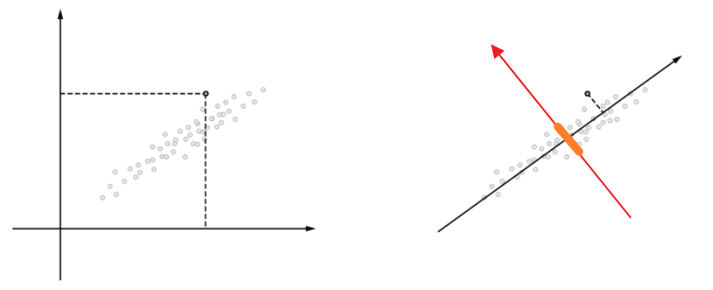 왼쪽에 2차원으로 표현된 데이터가 있다고 했을 때 이 데이터들을 차원 축소하여 1차원 축을 기준을 잡아서 표현한다고 가정하겠습니다.