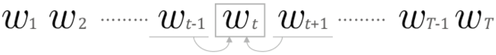 말뭉치를 w1,w2, ... ,wr 처럼 단어로 표기한다면 특정 단어와 그 단어에 대한 윈도우 크기가 1인 맥락을 다음과 같이 표현할 수 있습니다.