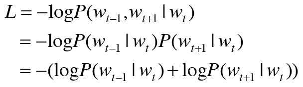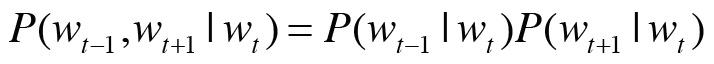 여기서 skip-gram 모델에서는 맥락의 단어들 사이에 관련성이 없다고 가정하고 다음과 같이 분해합니다.