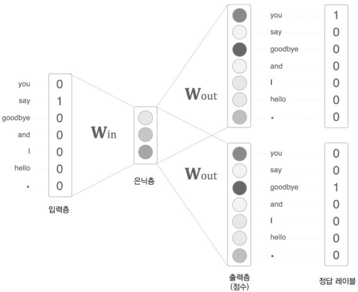 skip-gram 모델의 입력층은 하나이고, 반면 출력층이 맥락의 수만큼 존재합니다.