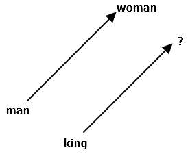 벡터 공간에서 'man -> woman' 벡터와 'king -> ? '벡터가 가능한 가까워지는 단어(?)를 찾는 것입니다.