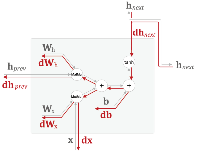 RNN 내부의 자세한 역전파 과정은 다음과 같습니다. ( 다음 글에서 역전파에 대해 좀 더 세부적으로 다룸)